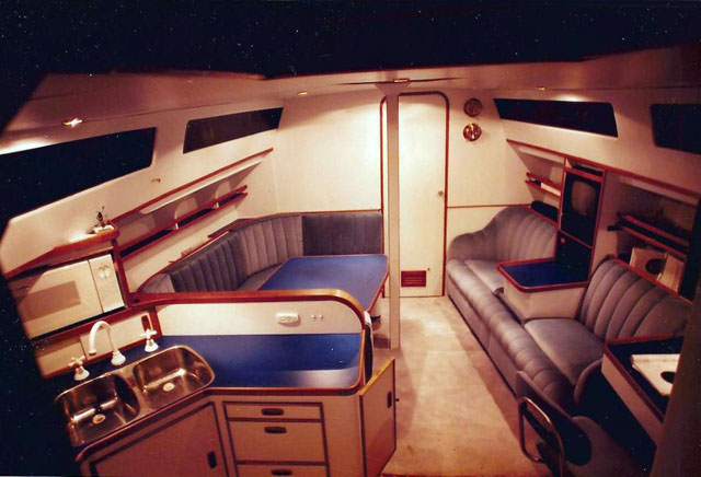 Clean white interior with teak trim, very comprehensive nav-station and galley.